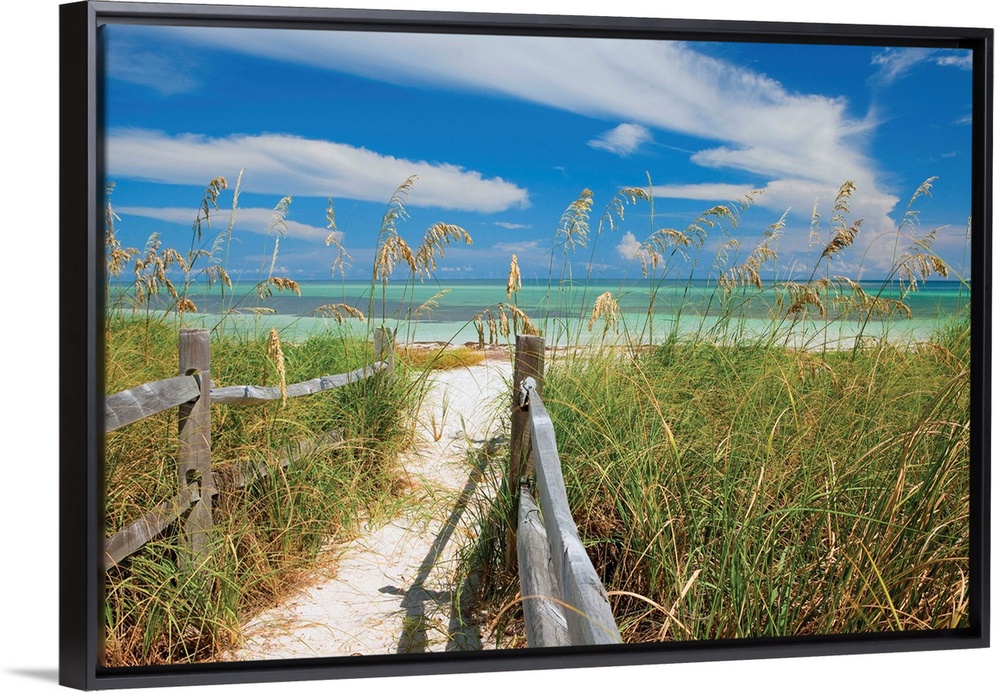 <p>Photograph of a sandy path lined with a wooden fence and beach grass leading to a sandy beach with clear, teal waters and a blue sky.</p>