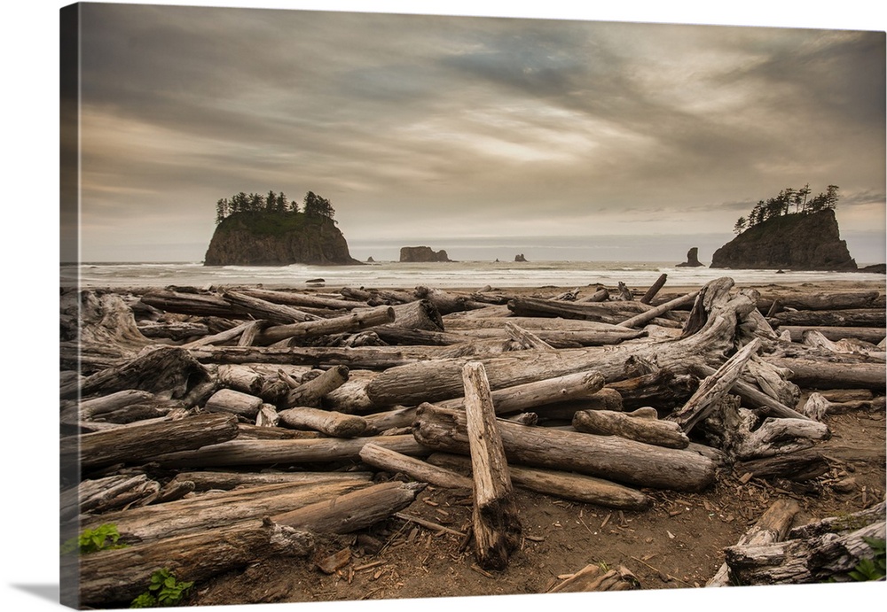 <p>Second Beach at sunset with scattered dead tree trunks on the sand.</p>