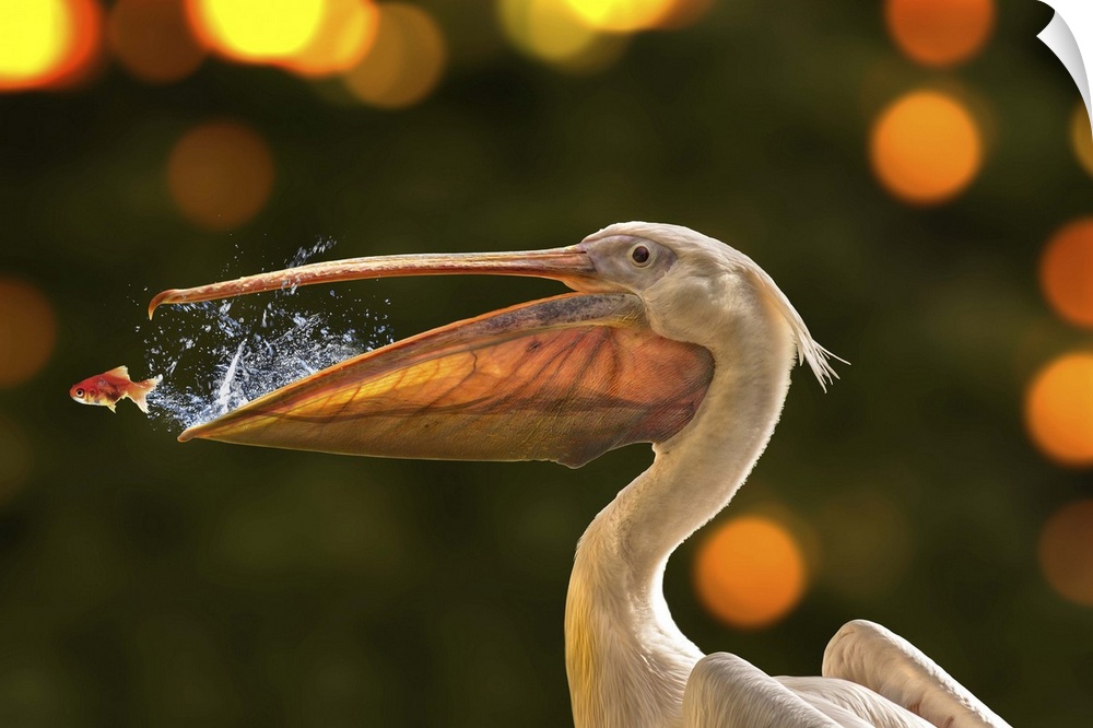 <p>Photograph of a pelican trying to catch a fish from a jumping out of its mouth.</p>
