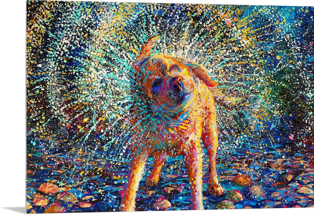 <p>Brightly colored contemporary artwork of a tan dog shaking off water.</p>