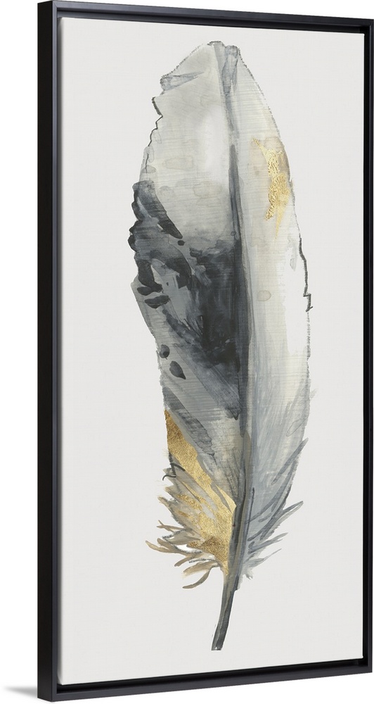 <p>Panel painting of a grey, white, and gold feather on a solid white background.</p>