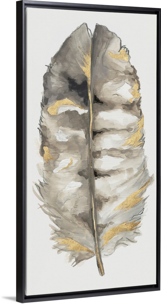 <p>Panel painting of a grey, white, and gold feather on a solid white background.</p>