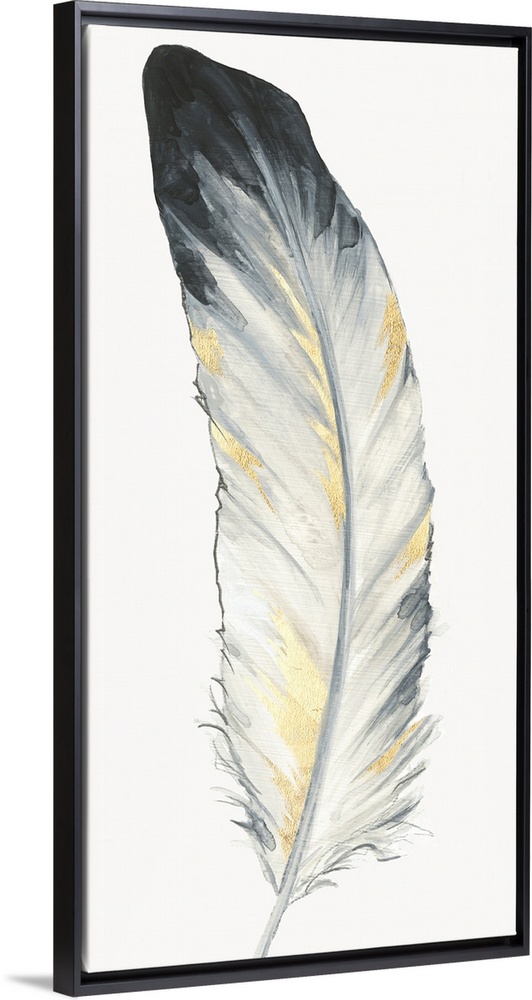 <p>Panel painting of a grey, white, and gold feather on a solid white background.</p>