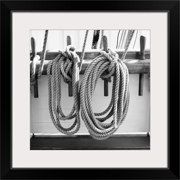 <p>Black and white photograph of details of a sailboat.</p>