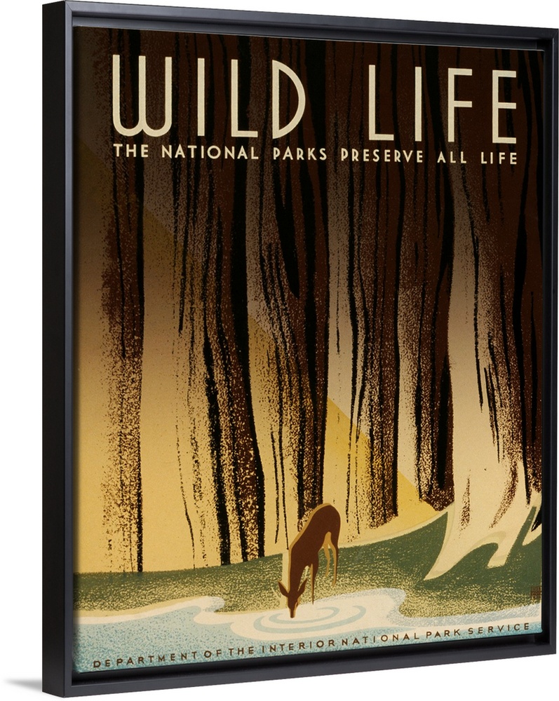 <p>Vintage advertising poster for the US National Parks, with a deer drinking from a stream.</p>
