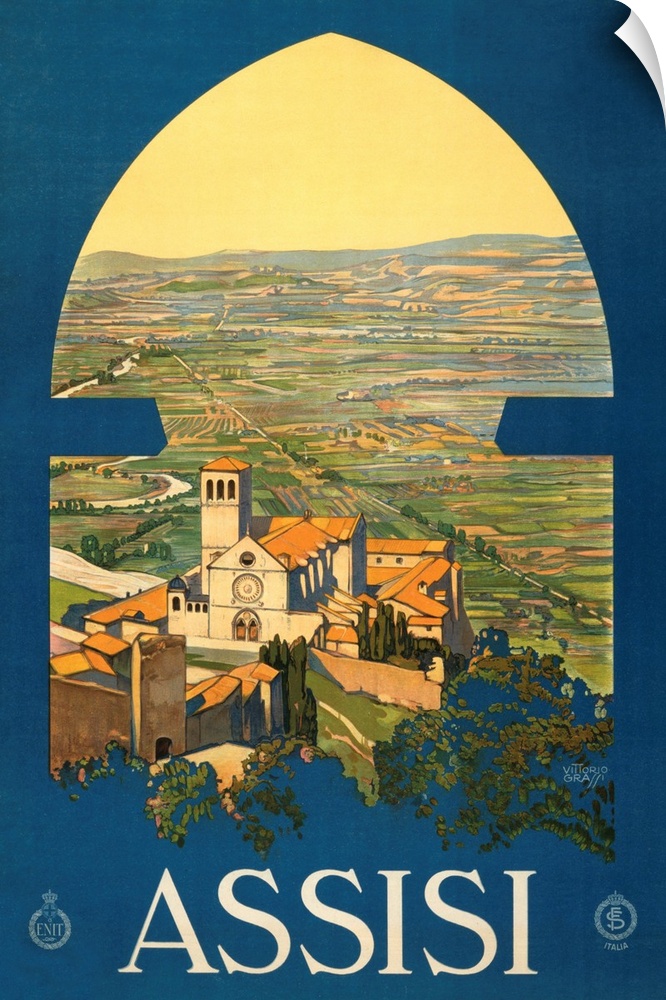 <p>Vintage travel advertisement for Assisi, Italy, with a view of the landscape and historic buildings.</p>