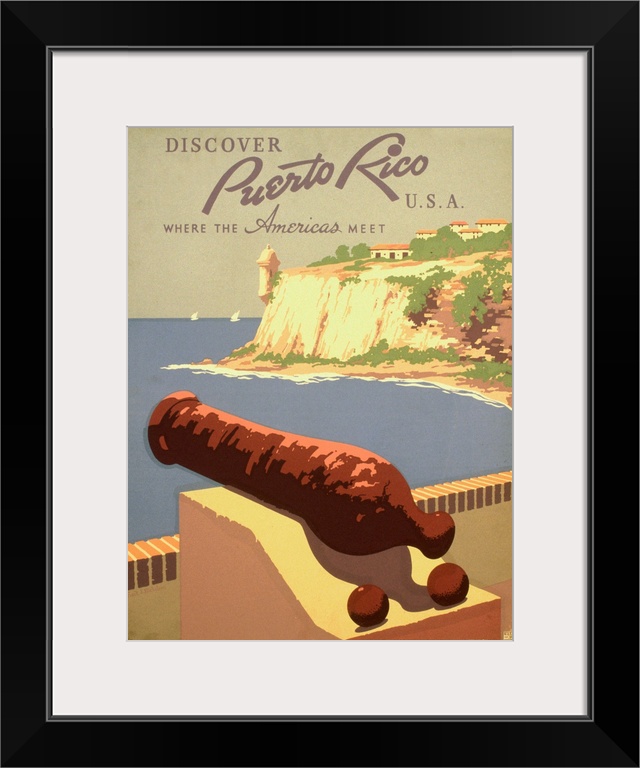 <p>Vintage travel poster advertising Puerto Rico, with a cannon overlooking the ocean.</p>