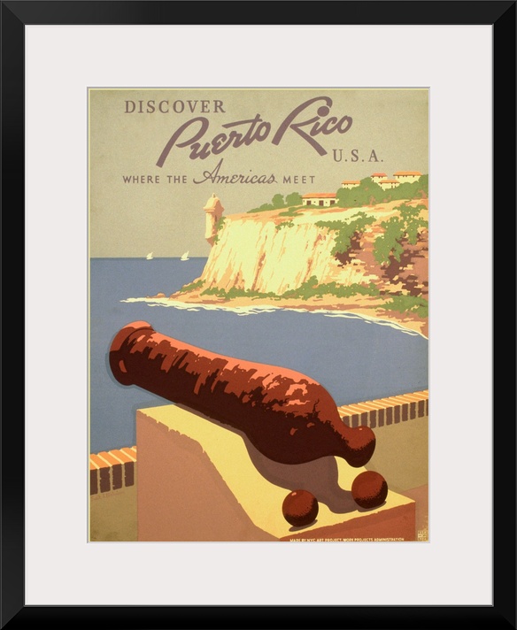 <p>Vintage travel poster advertising Puerto Rico, with a cannon overlooking the ocean.</p>