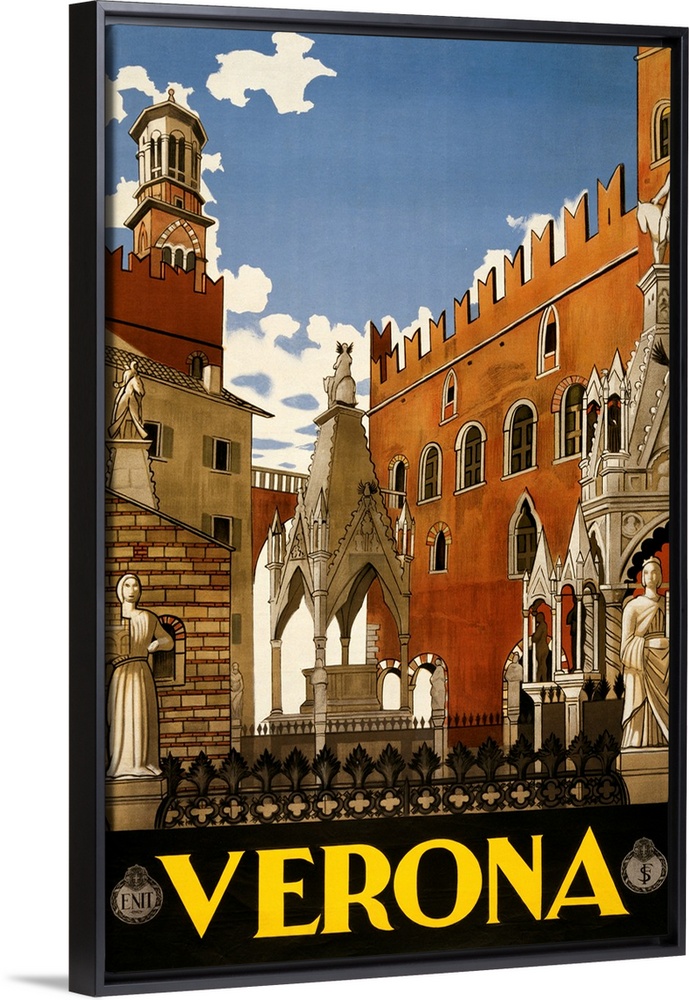 <p>Vintage travel advertisement for Verona, Italy, with historic architecture.</p>