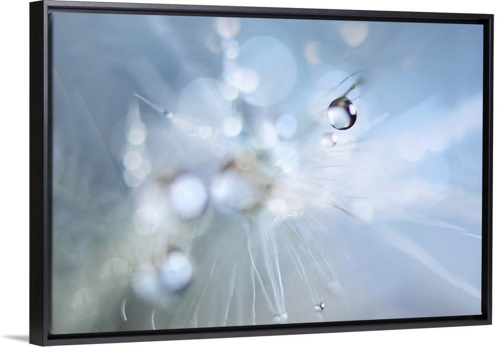 <p>Macro image of a dew drop on white dandelion seeds.</p>