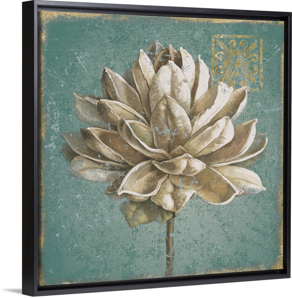 <p>A square decorative artwork of a large white bloom with a distress overlay and gold accents.</p>