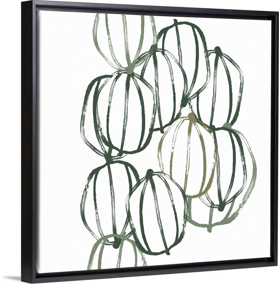 <p>Square contemporary artwork of seed pods in shades of green over a white background.</p>