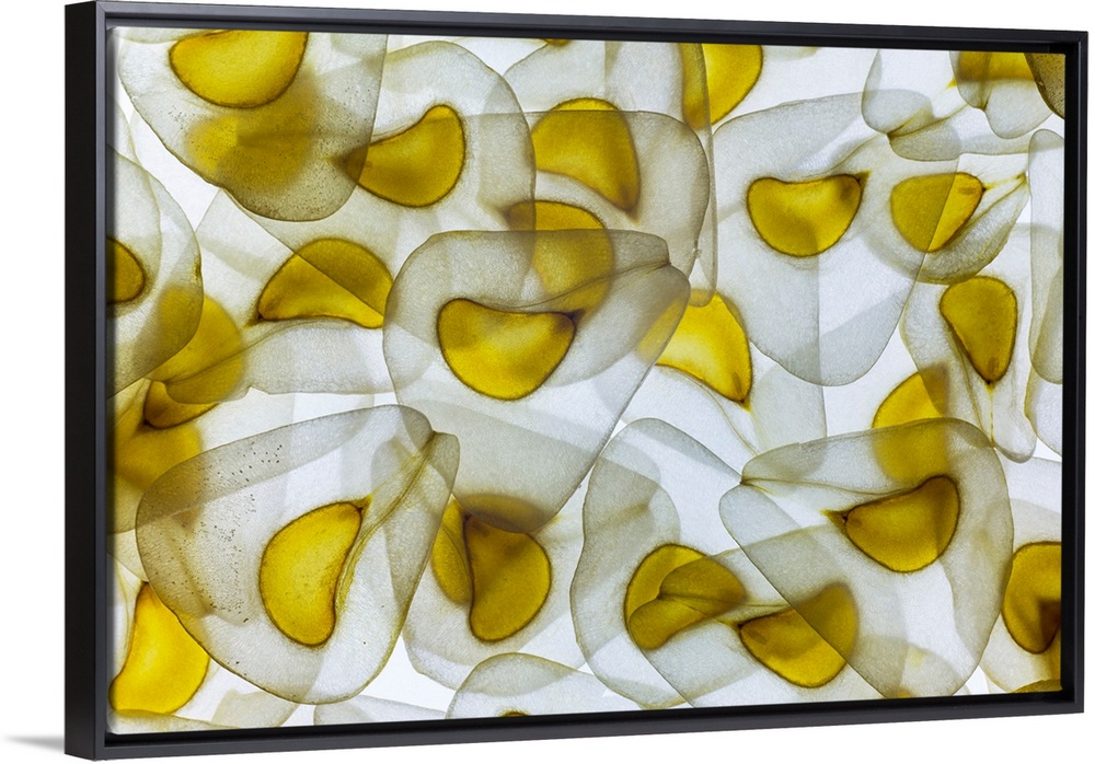 <p>Seeds of the giant Himalayan lily, Cardiocrinum giganteum. The picture shows mature dry seeds released from the capsule following its splitting. Each seed consists of a rounded triangular central region comprising the endosperm (yellow) with the embryo (small, darker tone) positioned at the sharpest apex, surrounded by a membraneous wing. Each seed is 12-15mm across and weighs approximately 5mg. The seed capsules develop on a stem up to 2.5m tall. Each produces many hundreds of seeds; their light weight and flattened structure ensures efficient wind dispersal away from the parent plant. C. giganteum is a spectacular hardy perennial garden plant which bears large trumpet-shaped lily-like flowers in midsummer. It is monocarpic; the plant dies after flowering, leaving offset bulbs in the ground to flower in subsequent years.</p>