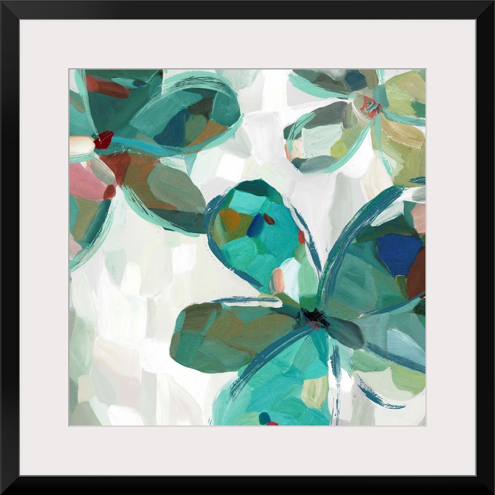 <p>Contemporary artwork of teal flowers with large round petals.</p>