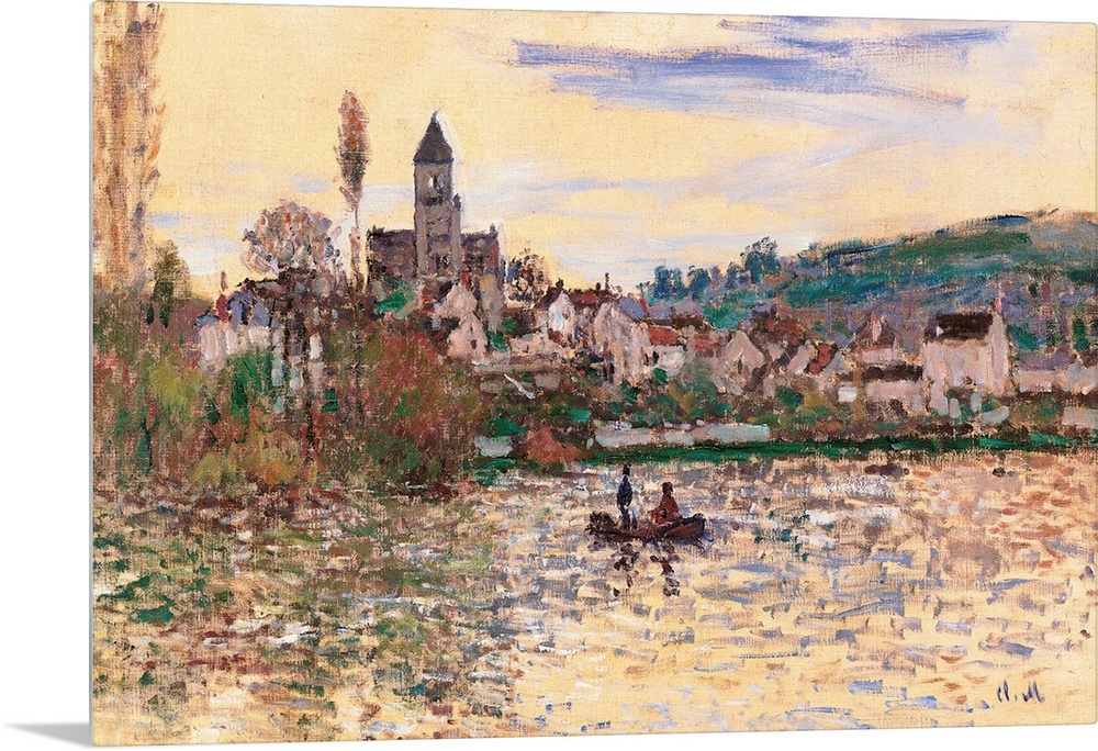 <p>The Seine at Vtheuil, by Claude Monet, 1879 - 1880, 19th Century, oil on canvas, cm 43,5 x 70,5 - France, Ile de France, Paris, Muse dOrsay, RF1937-3. All. Landscape Vtheuil grey green trees houses grass church bell tower roofs sky Seine river boat clouds</p>
