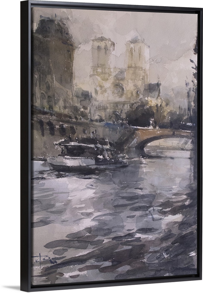 <p>Gestural brush strokes of subdued watercolors create a winter scene of the river Seine with Petit Pont Bridge in foreground and Notre Dame in Background.</p>