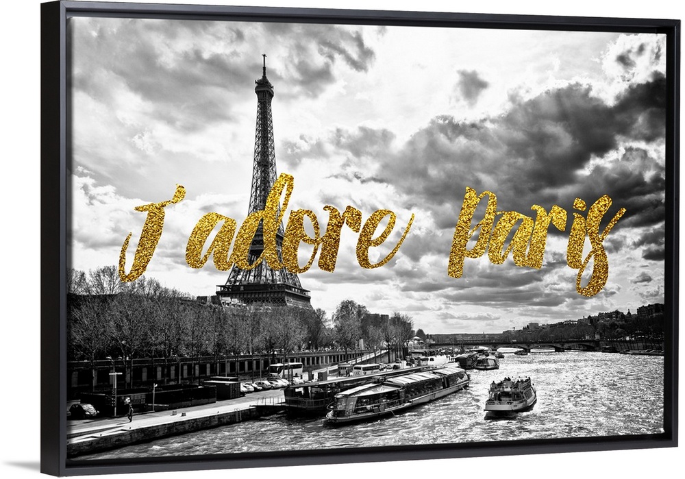 <p>Black and white photograph of the Seine River with the Eiffel Tower in the background and the phrase "J'adore Paris" written in gold glitter on top. From the Paris Fashion Series.</p>