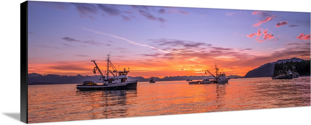 <p>Seiners anchored in Amalga Harbor at sunset awaiting a commercial salmon opening, Southeast Alaska; Juneau, Alaska, United States of America.</p>