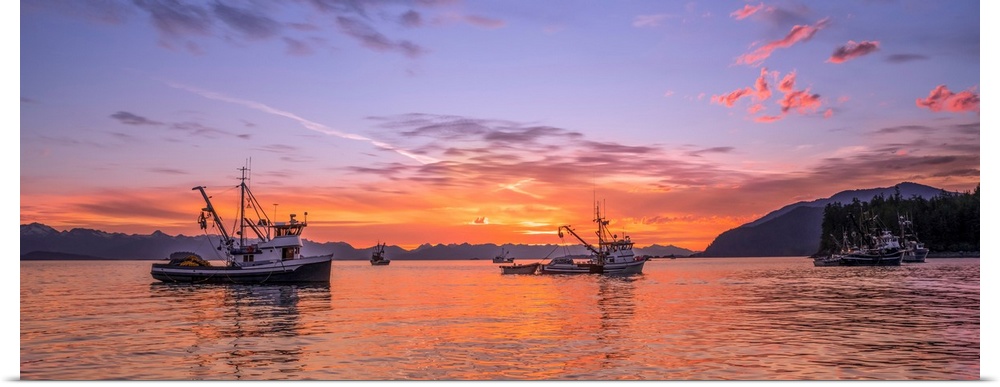 <p>Seiners anchored in Amalga Harbor at sunset awaiting a commercial salmon opening, Southeast Alaska; Juneau, Alaska, United States of America.</p>