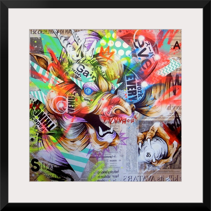 <p>Contemporary artwork with a vibrant urban art feel, using wild colors and shapes.</p>