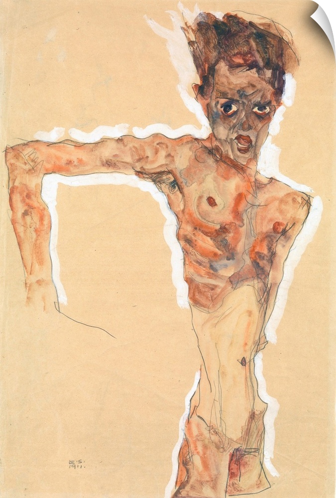 <p>Egon Schiele's career was short, intense, and amazingly productive. Before succumbing to influenza in 1918 at the age of twenty-eight, he created over three hundred oil paintings and several thousand works on paper. The human figure provided Schiele with his most potent subject matter for both paintings and drawings. The self-portraits of his large series of watercolors and paintings produced between 1910 and 1918-of which this one is a prime example-are searing, psychologically complex images. The emaciated, tortured figure of the artist, bony and angular, bristles with an inner tension made visible by the agitated pencil line and painted white surrounding aura. Schiele stares wildly, his large, dark eyes glaring menacingly, his mouth open, and his shock of hair standing on end. In a pose suggestive of the crucified Christ, his arm is thrust out awkwardly and bent sharply at the elbow. Color is limited to shades of brown, with only certain areas of the body (mouth, nipples, navel, and genitals) tinted red.</p>