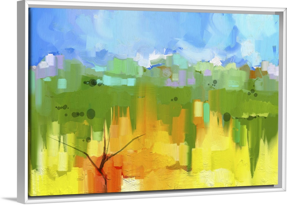 <p>Originally an abstract oil painting landscape on canvas. Semi- abstract image of tree in yellow and green field with blue sky. Spring season nature background.</p>