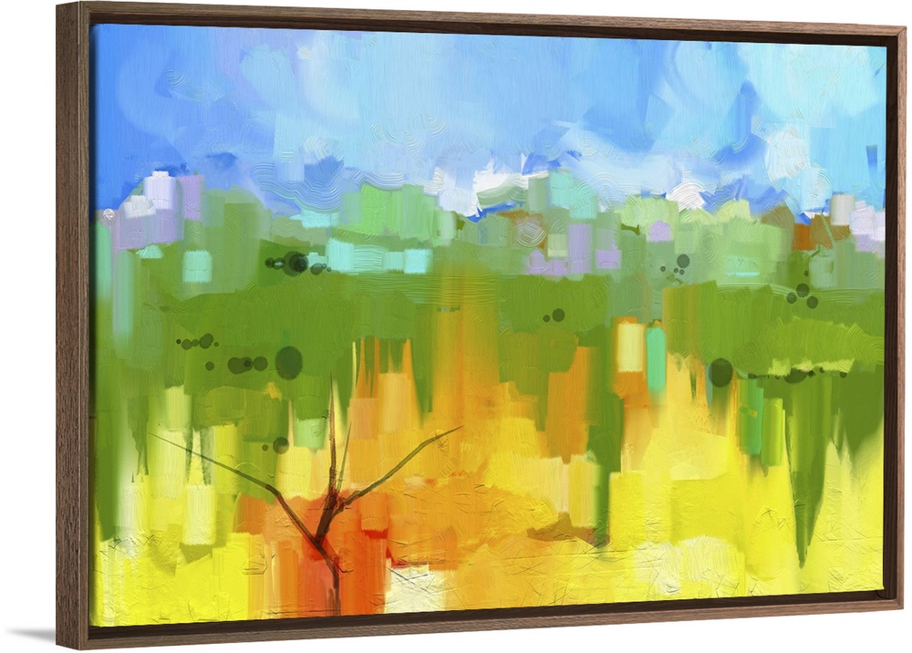 <p>Originally an abstract oil painting landscape on canvas. Semi- abstract image of tree in yellow and green field with blue sky. Spring season nature background.</p>