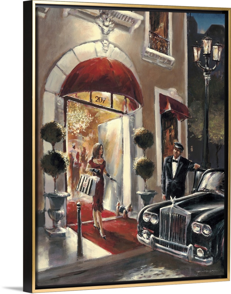 <p>Contemporary painting of a woman in a red dress walking out store, with a dog on a leash in one hand and shopping bags in the other.</p>