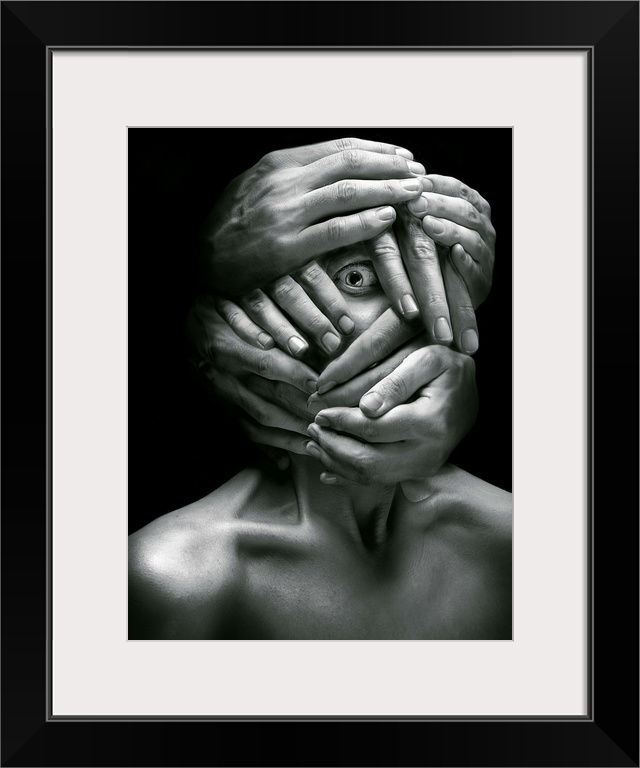 <p>Portrait of a person whose face is covered in several hands, with one eye visible.</p>
