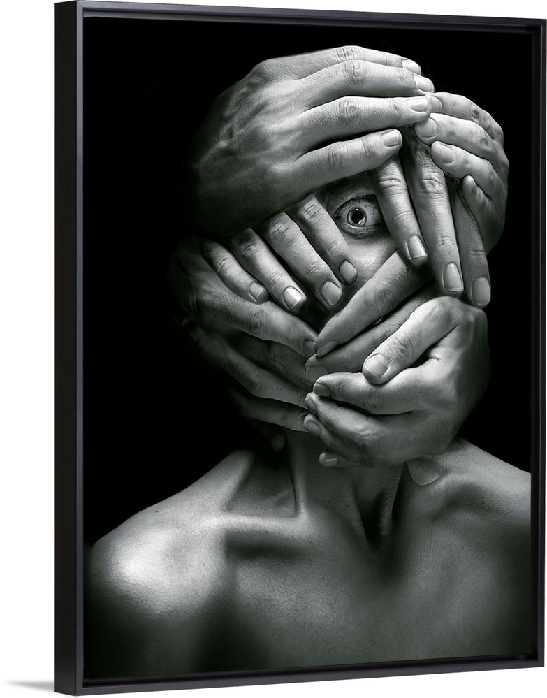 <p>Portrait of a person whose face is covered in several hands, with one eye visible.</p>
