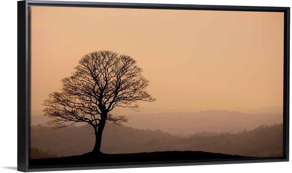 <p>A photograph of a silhouetted bare branched tree standing lone against a hazy landscape background.</p>