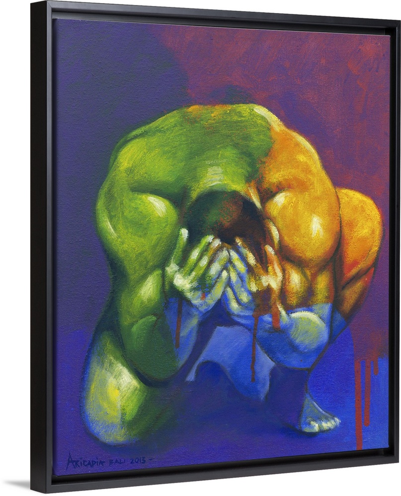 <p>With head in hands, a man is distraught. Red paint flows like desperation from his hands, or perhaps like the blood of his lacerated emotions. Aricadia paints a dramatic portrait in vivid color. 'Where did you hide Adam's rib? He laid it in Canaan with the dry body Because the memory of the separation with Eve Hurts more than the separation itself,' the artist says.</p>