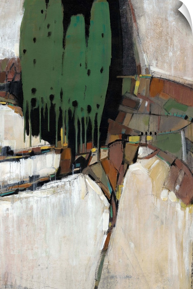 <p>This abstract artwork features blocks of bright color, paint drips and organic lines.</p>