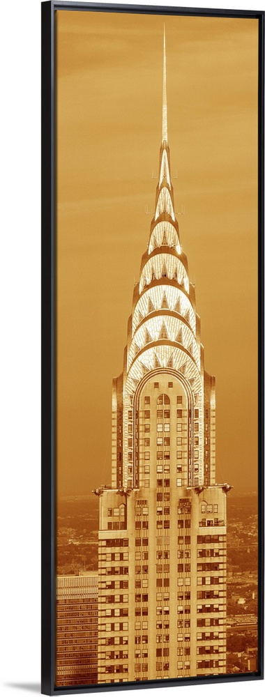 <p>This is a sepiatone close up of the Chrysler Building at sunset. It is the view from 42nd Street and 5th Avenue.</p>