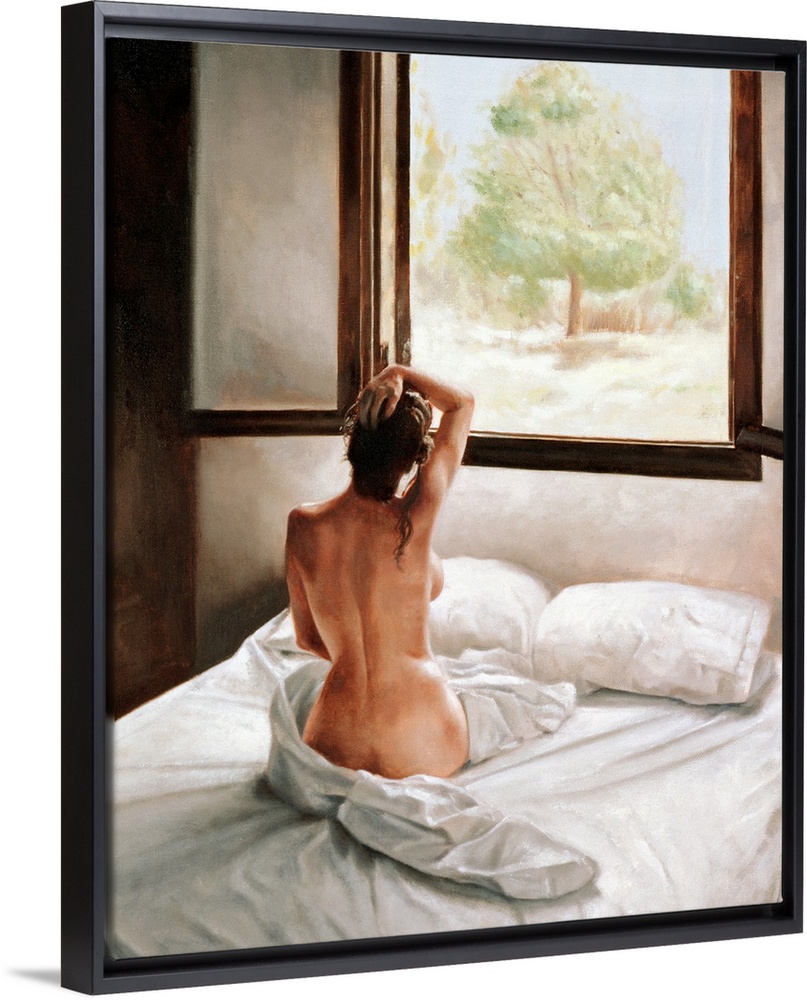 <p>An oil painting of a nude woman sitting up in bed with only a view of her back looking out a large window at a tree in the distance.</p>