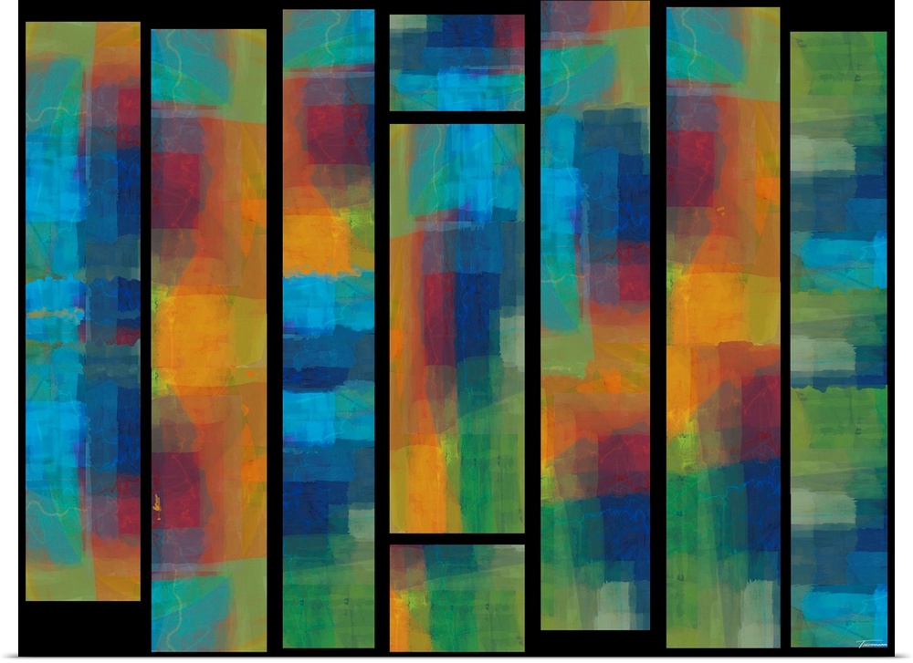 <p>Abstract artwork with colorful stained glass window like designs on a black background.</p>