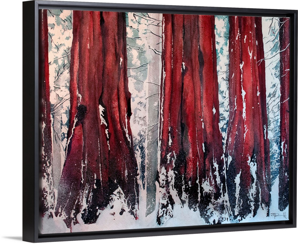 <p>Painting of a forest of tall sequoia trees in the winter.</p>