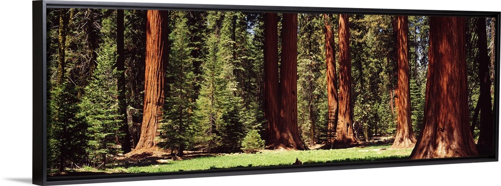 <p>Wide angle photograph taken of a national park forest that shows the trunks of large redwood trees.</p>