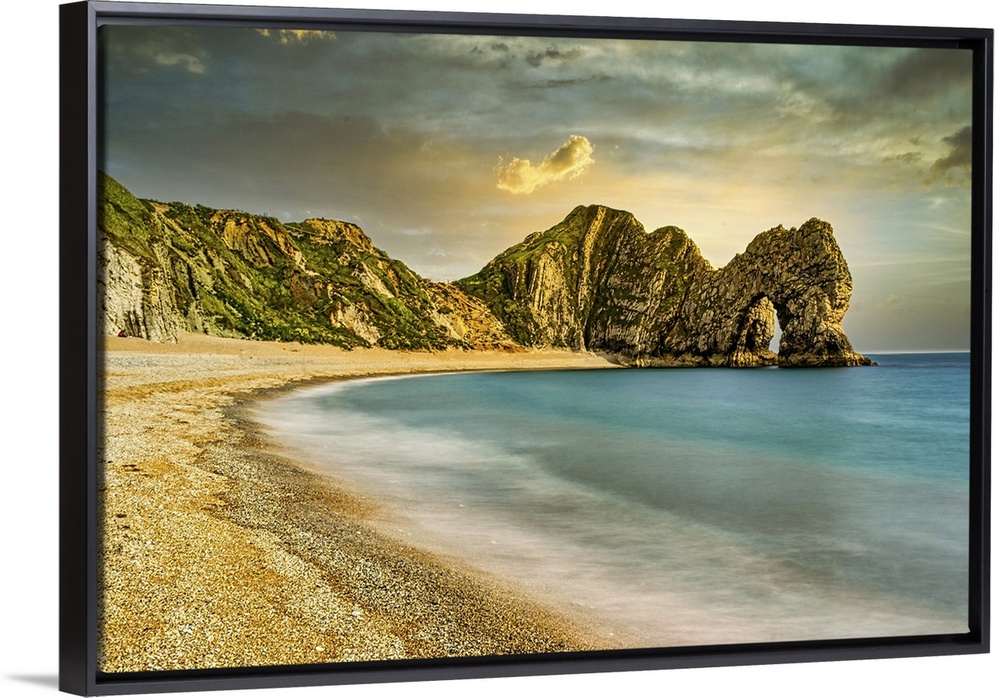 <p>Serene beach with smooth waters, golden sand, and rugged cliffs under a sunset sky at Durdle Door, Jurassic Coast, UNESCO World Heritage Site, Dorset, England, United Kingdom, Europe</p>