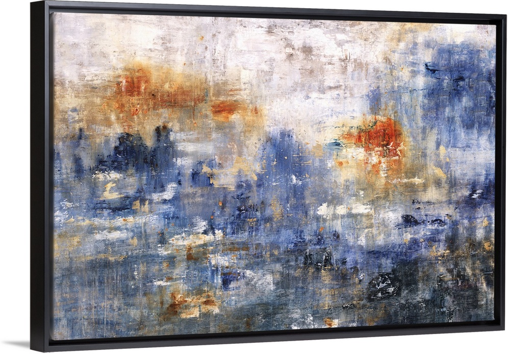 <p>Large abstract art with shades of blue, orange, and gray.</p>
