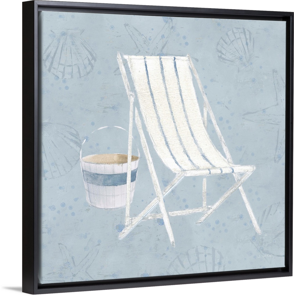 <p>Square art with an illustration of a white beach chair with blue stripes and a bucket on a light blue background with seashells.</p>