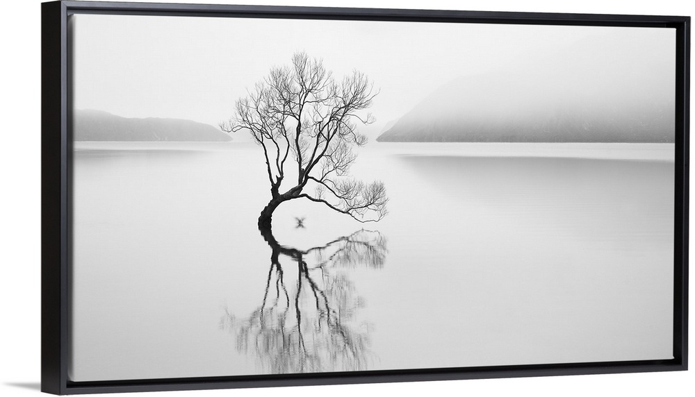 <p>A tree with bare branches submerged in a lake, with its mirror image reflecting in the water.</p>