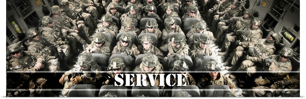 <p>Panoramic photograph of Military Soldiers sitting inside a plane with the word "Service" written across the bottom.</p>