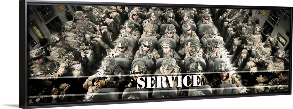<p>Panoramic photograph of Military Soldiers sitting inside a plane with the word "Service" written across the bottom.</p>