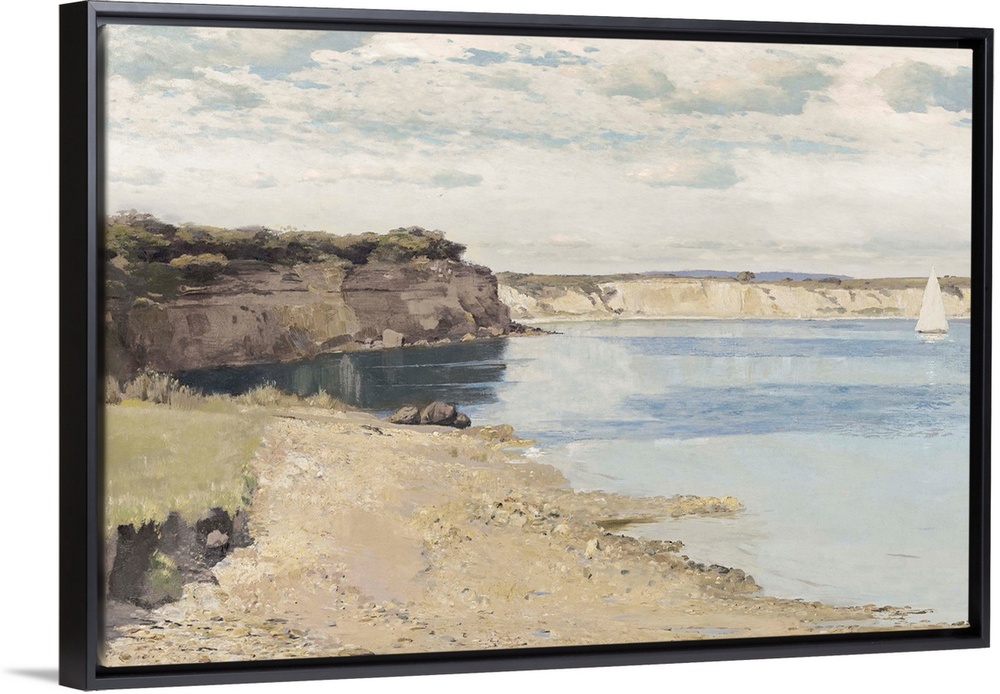 <p>This sunny contemporary artwork is of a shore landscape with a sailing boat drifting off to sea.</p>