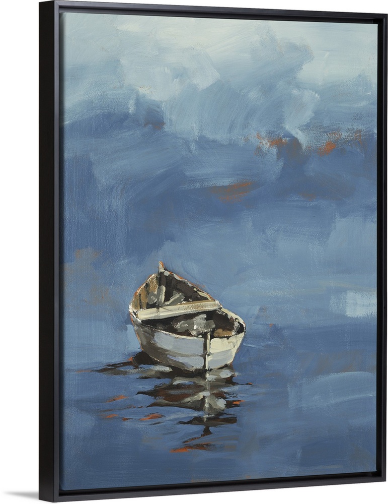 <p>Art print of a lonely wooden boat floating on the water.</p>