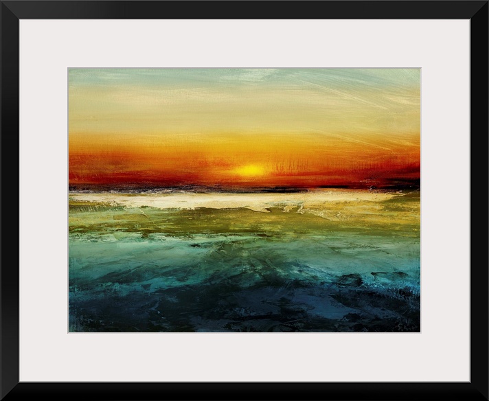 <p>Contemporary abstract artwork features a setting sun on the horizon with a distressed texture throughout.</p>