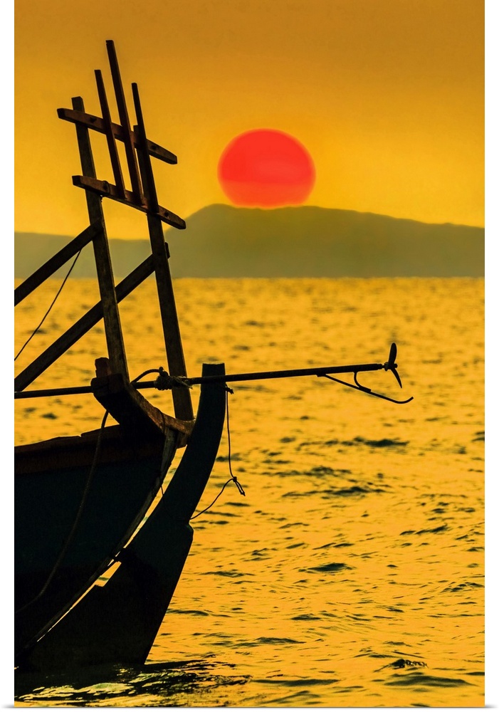 <p>Big red setting sun beyond fishing boat moored off beach south of the city, Otres Beach, Sihanoukville, Cambodia, Indochina, Southeast Asia, Asia</p>