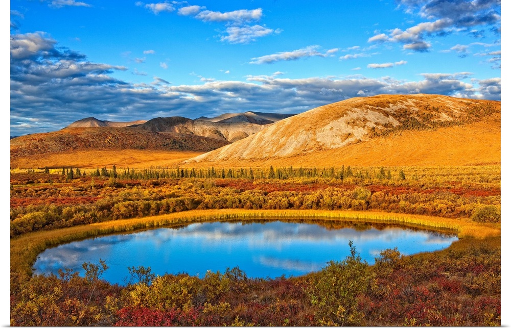 <p>The Setting Sun Illuminates The Vibrant Colours Of The Tundra And A Pond Along The Dempster Highway; Yukon Canada</p>