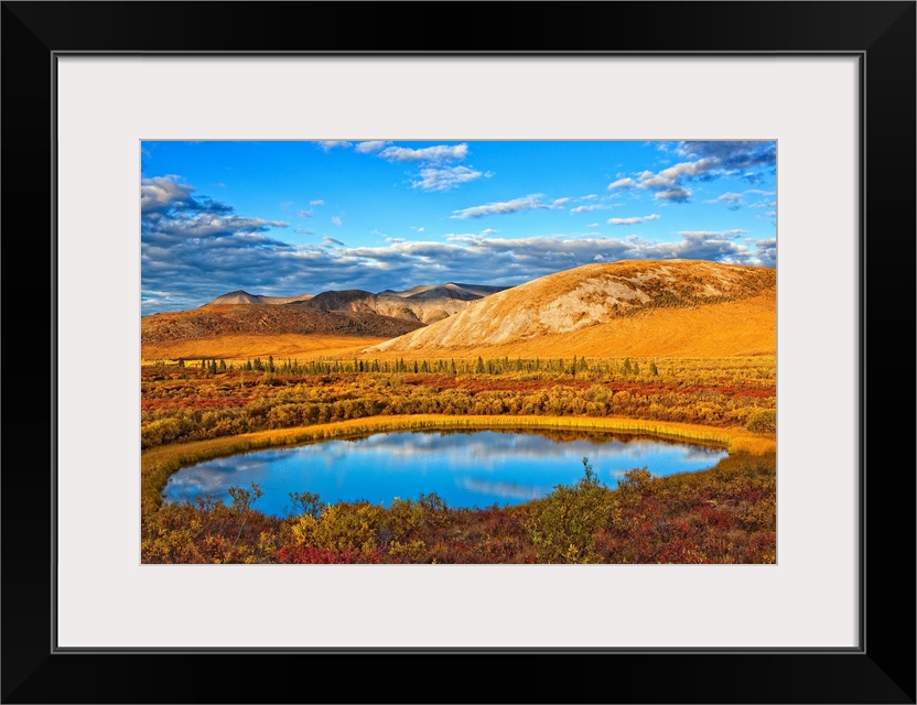 <p>The Setting Sun Illuminates The Vibrant Colours Of The Tundra And A Pond Along The Dempster Highway; Yukon Canada</p>